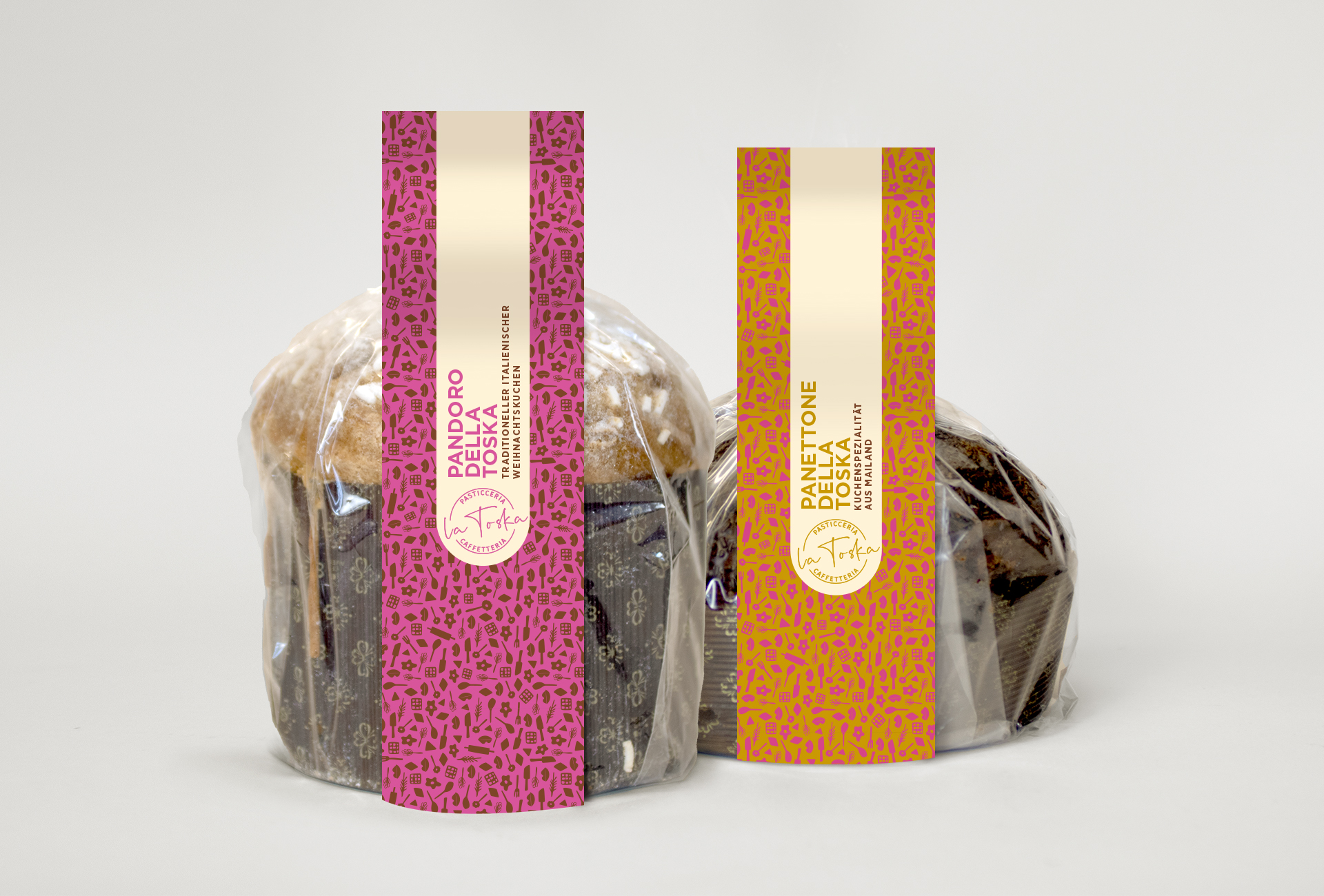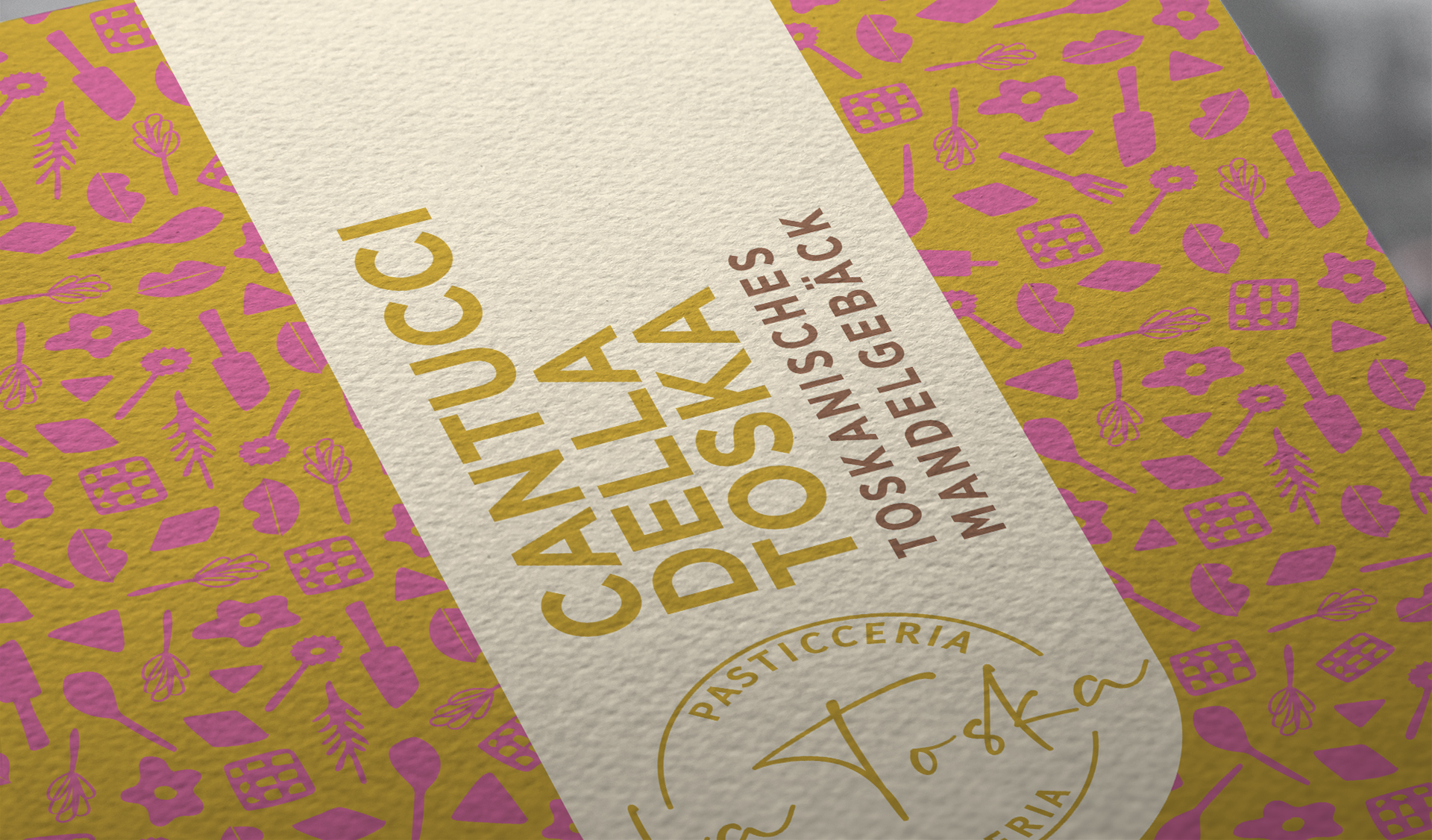 Zentrales Gestaltungselement ist ein sympathisches Pattern aus eigens zusammengestellten Illustrationen – inspiriert von klassischen Backwerkzeugen und traditionellen Formen aus der toskanischen Backkunst. Das Muster spielt in verschiedenen Farbvarianten mit der Produktvielfalt und sorgt zugleich für einen hohen Wiedererkennungswert.