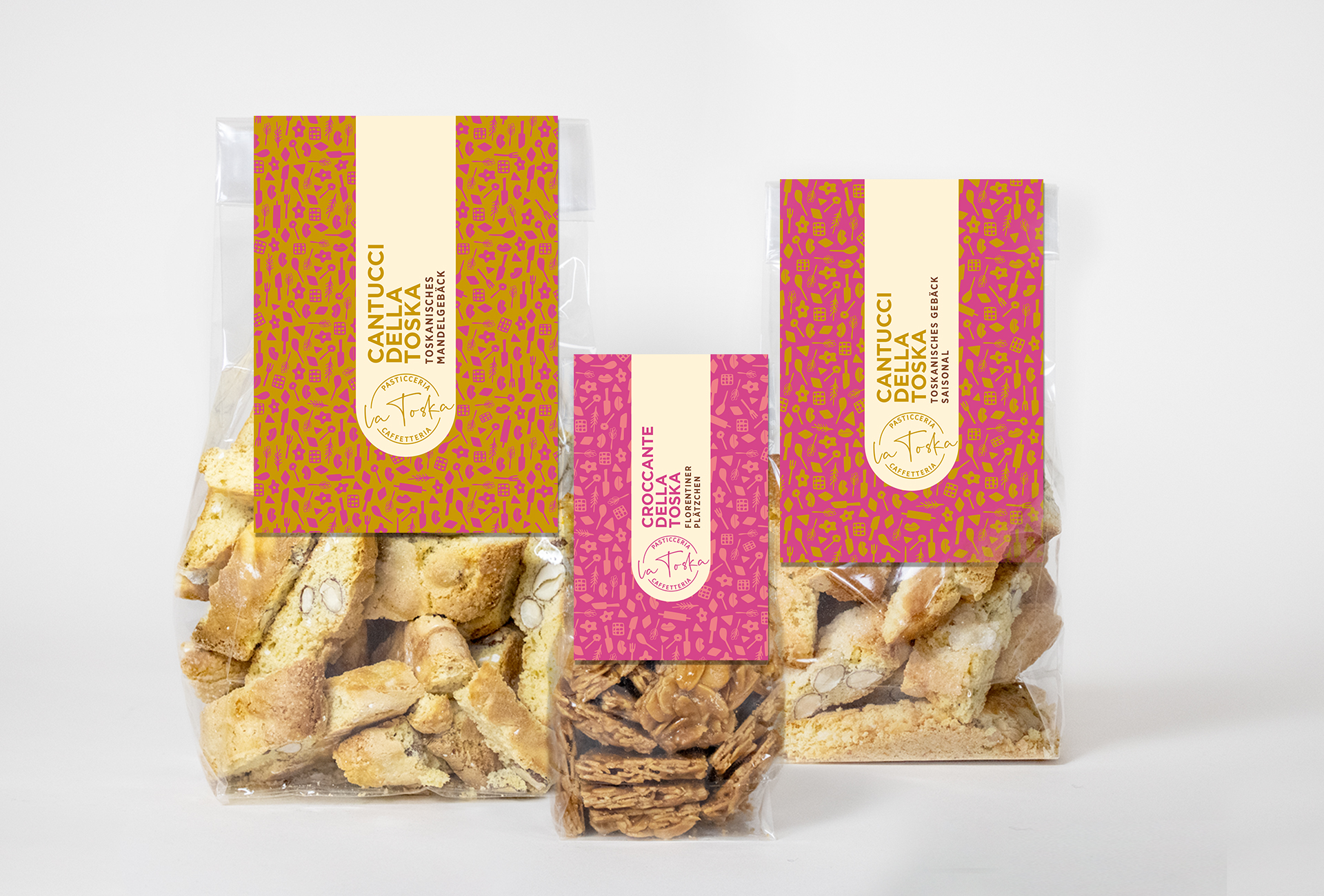 Für den wirtschaftlichen und gestalterischen Feinschliff wurde eine flexible Verpackung entwickelt: Die süßen Spezialitäten werden in neutralen Cellophantüten verpackt und mit einer individuell bedruckten Banderole oder Lasche versehen. Zwei Formate decken dabei verschiedene Produkttypen ab – von Cantuccini bis hin zum saisonalen Panettone.