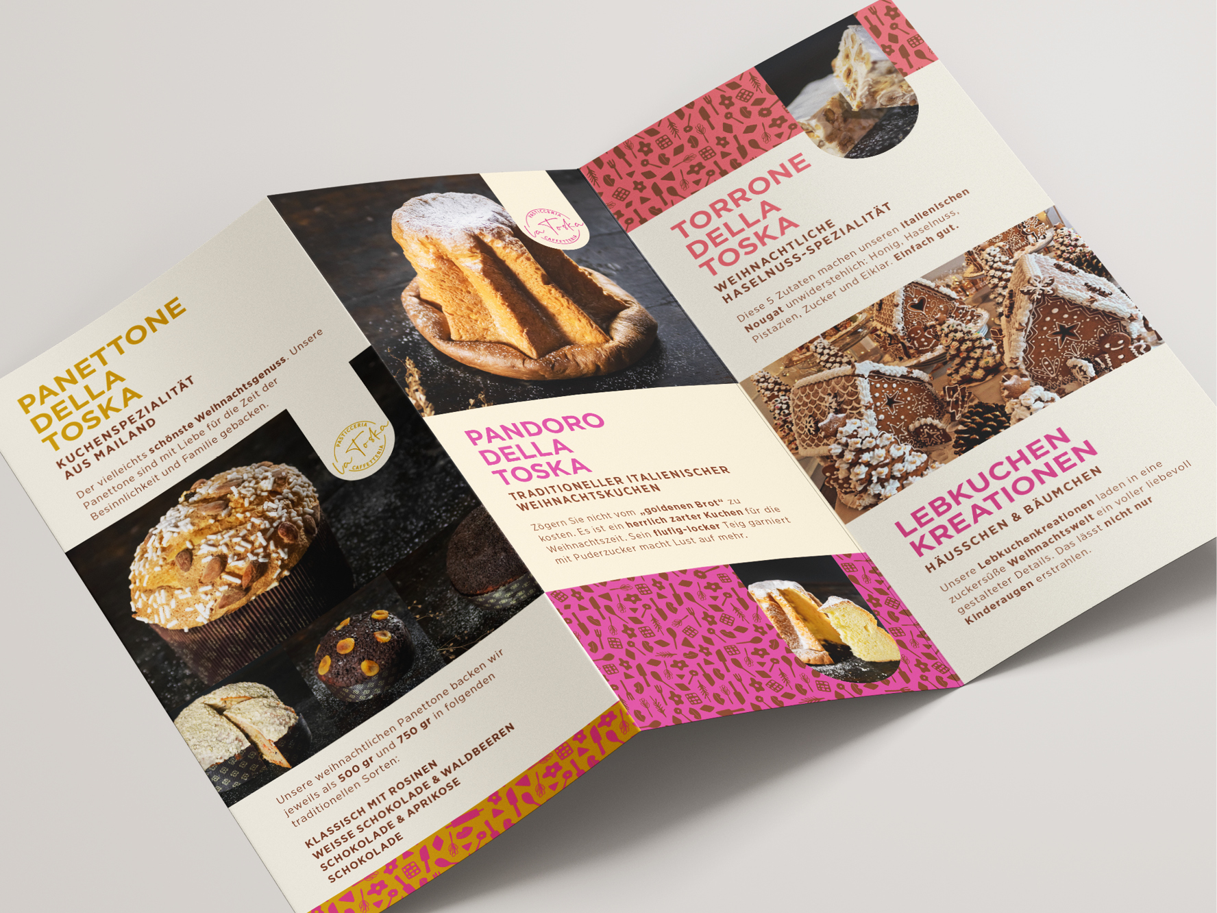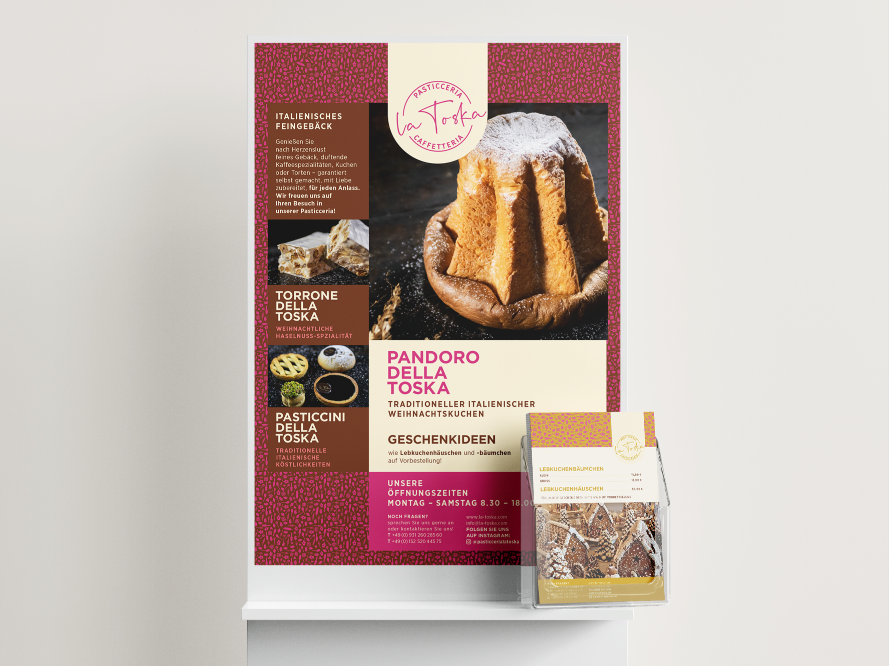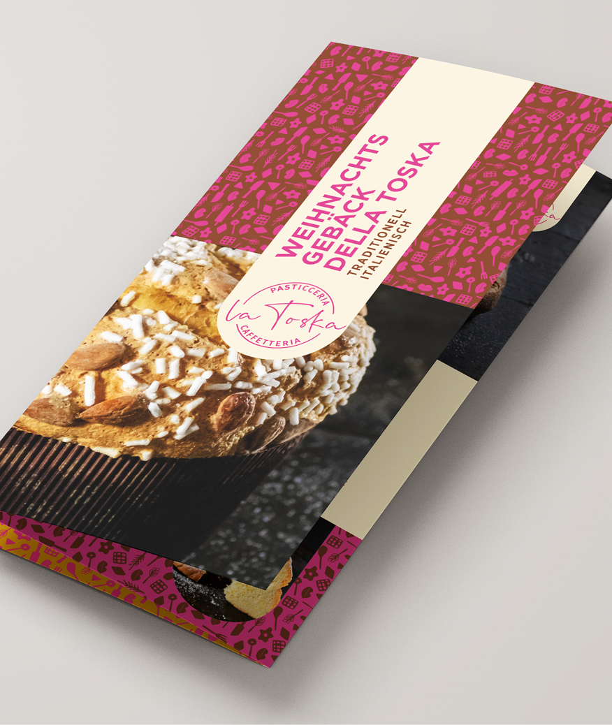 Mit der Eröffnung der Pasticceria La Toska lag der Fokus auf einem ebenso geschmackvollen wie hochwertigen Markenauftritt. Ergänzend zur entwickelten Markenausstattung wurden verschiedene Maßnahmen der Unternehmenskommunikation gestaltet, um Produkte sichtbar zu machen und die neue Marke im öffentlichen Raum zu verankern.